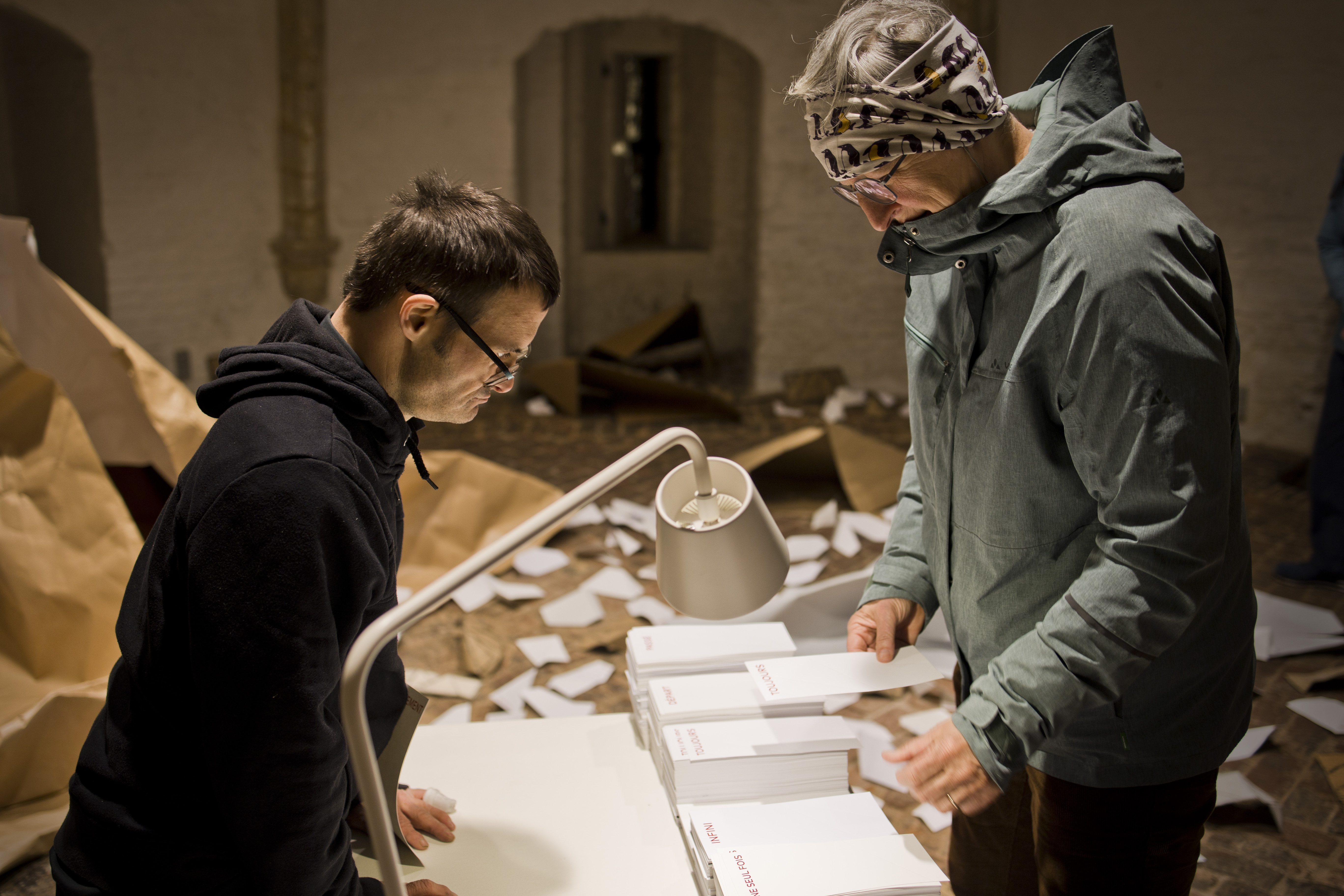 De flarden worden plooivormen, de plooivormen dan weer een installatie. Het gedicht wordt je toegefluisterd